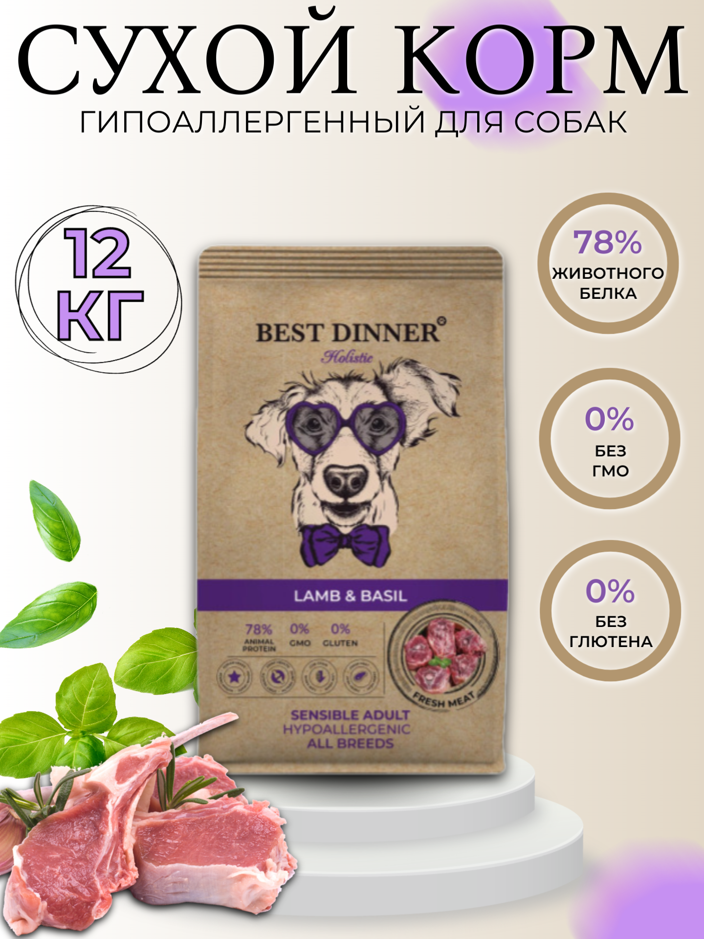 Сухой корм Best Dinner Holistic Adult Sensible Hypo All Breeds для взрослых собак всех пород с ягнёнком и базиликом 12кг