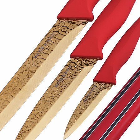 | Плюсы: | Купила на подарок дочери. Любит все красное, а тут ручки красные. Оригинальный рисунок на лезвии, классно смотрится. Достаточно острые. Удобнный магнитный держатель. |