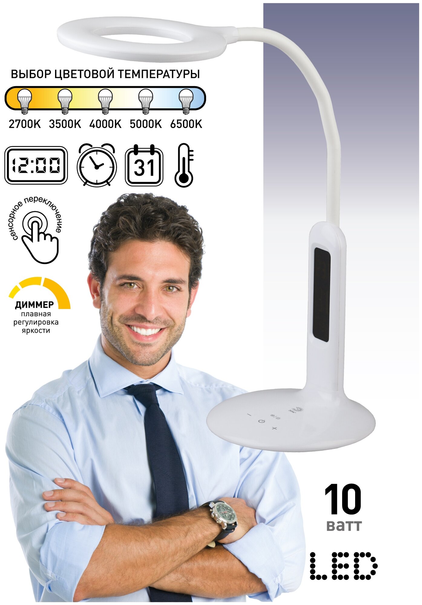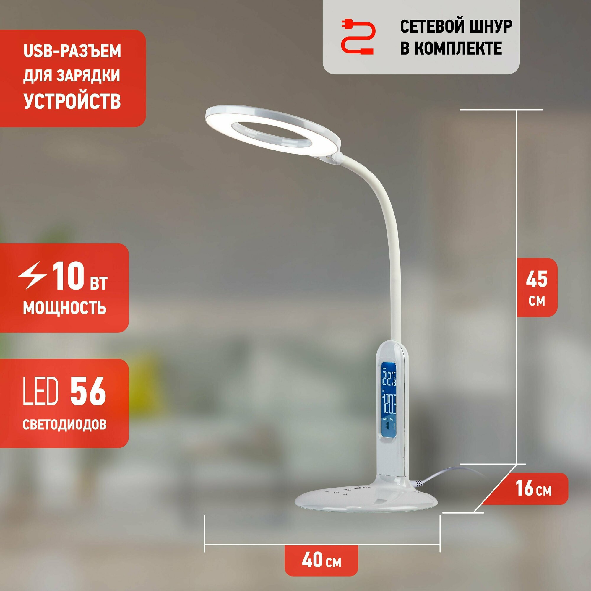 Офисная настольная лампа светодиодная с диммером и выключателем термометром будильником и часами NLED-476-10W-W (ЭРА)