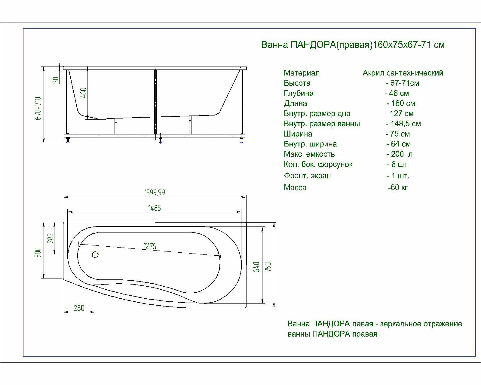 | Дополнительная информация | левосторонняя; каркас, слив-перелив, фронтальная панель в комплекте |