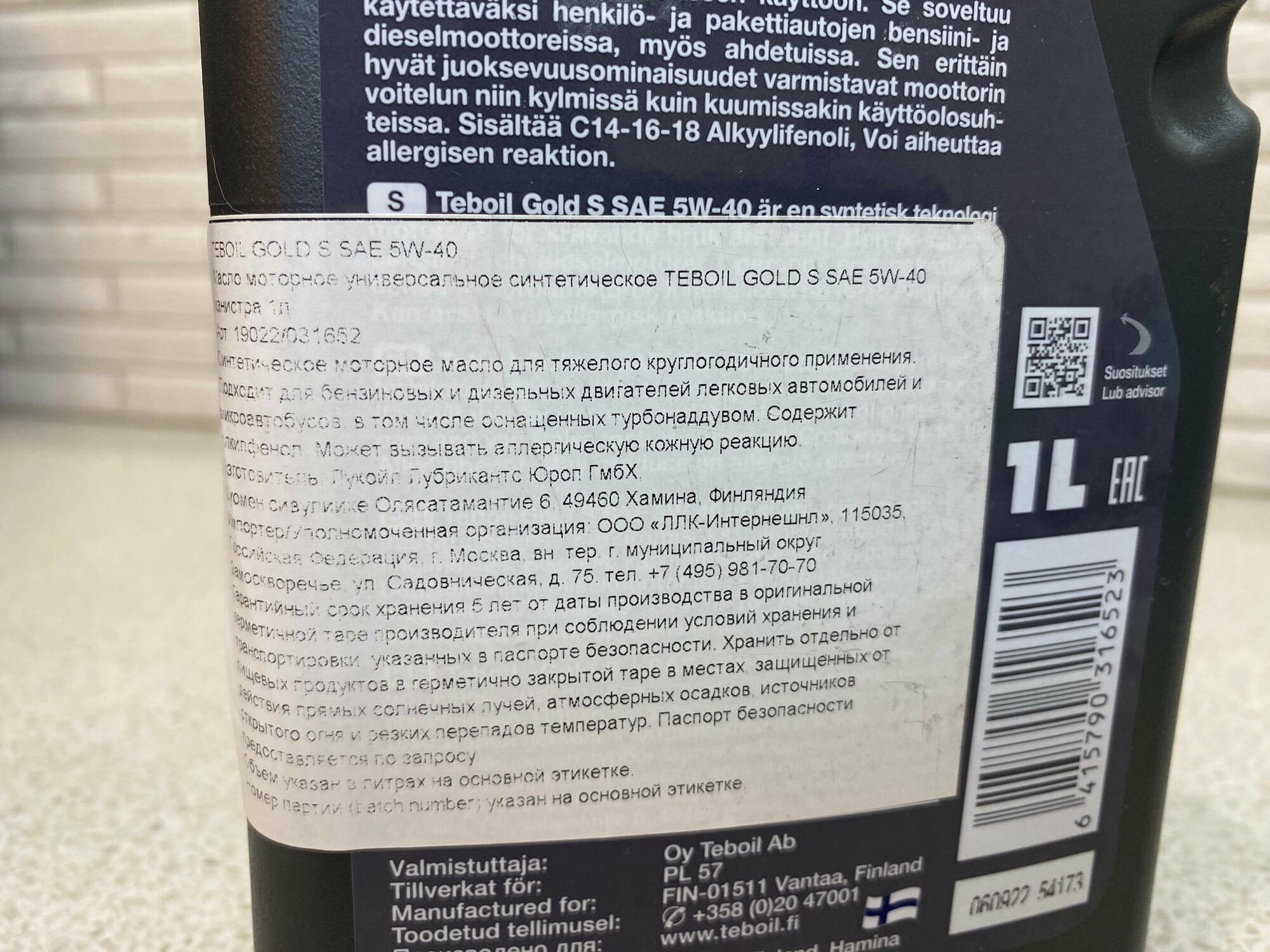 TEBOIL 19022 Масло моторное TEBOIL GOLD S 5W-40 синтетическое 1 л 19022