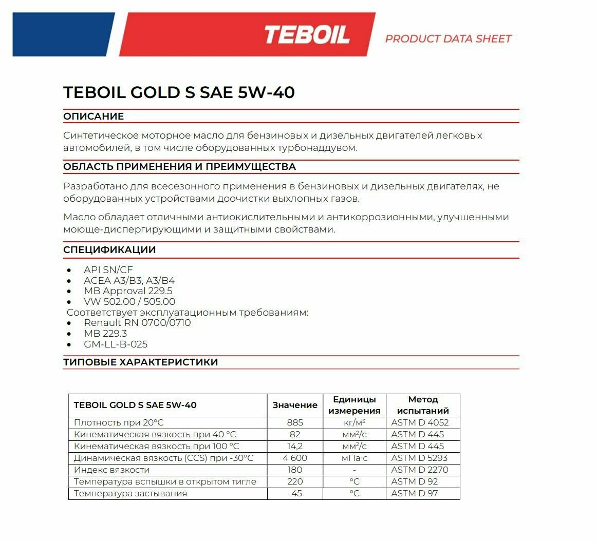 Teboil 5W-40 Gold S A3/B4 Sn/Cf 4Л (Синт. Мотор. Масло)