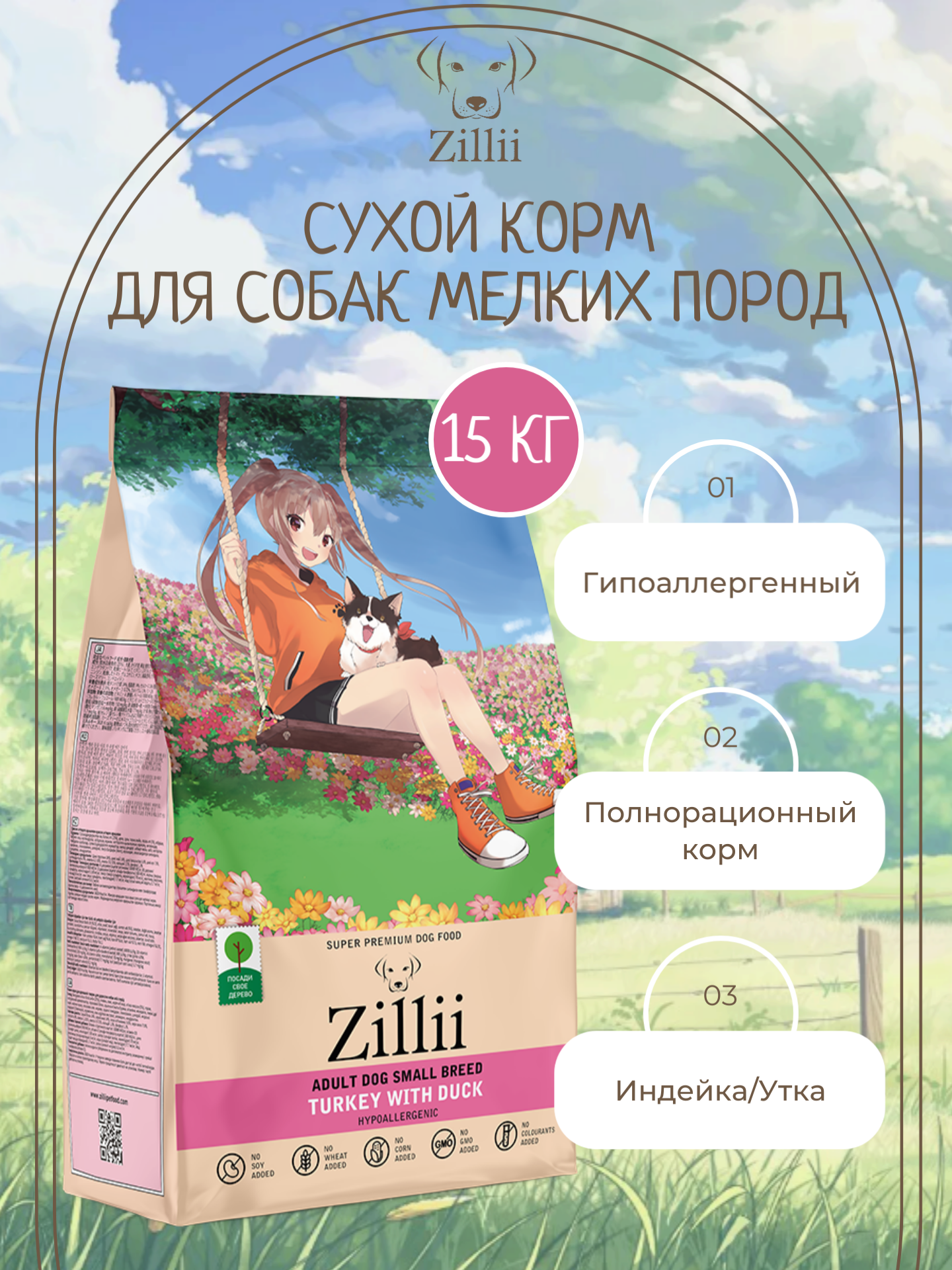 ZILLII (Зилли) Adult Dog Small Breed корм сухой для взрослых собак мелких пород 15 кг Индейка с Уткой, гипоаллергенный