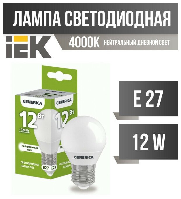 Лампа светодиодная G45 12Вт шар 4000К E27 230В GENERICA, IEK LL-G45-12-230-40-E27-G (1 шт.)