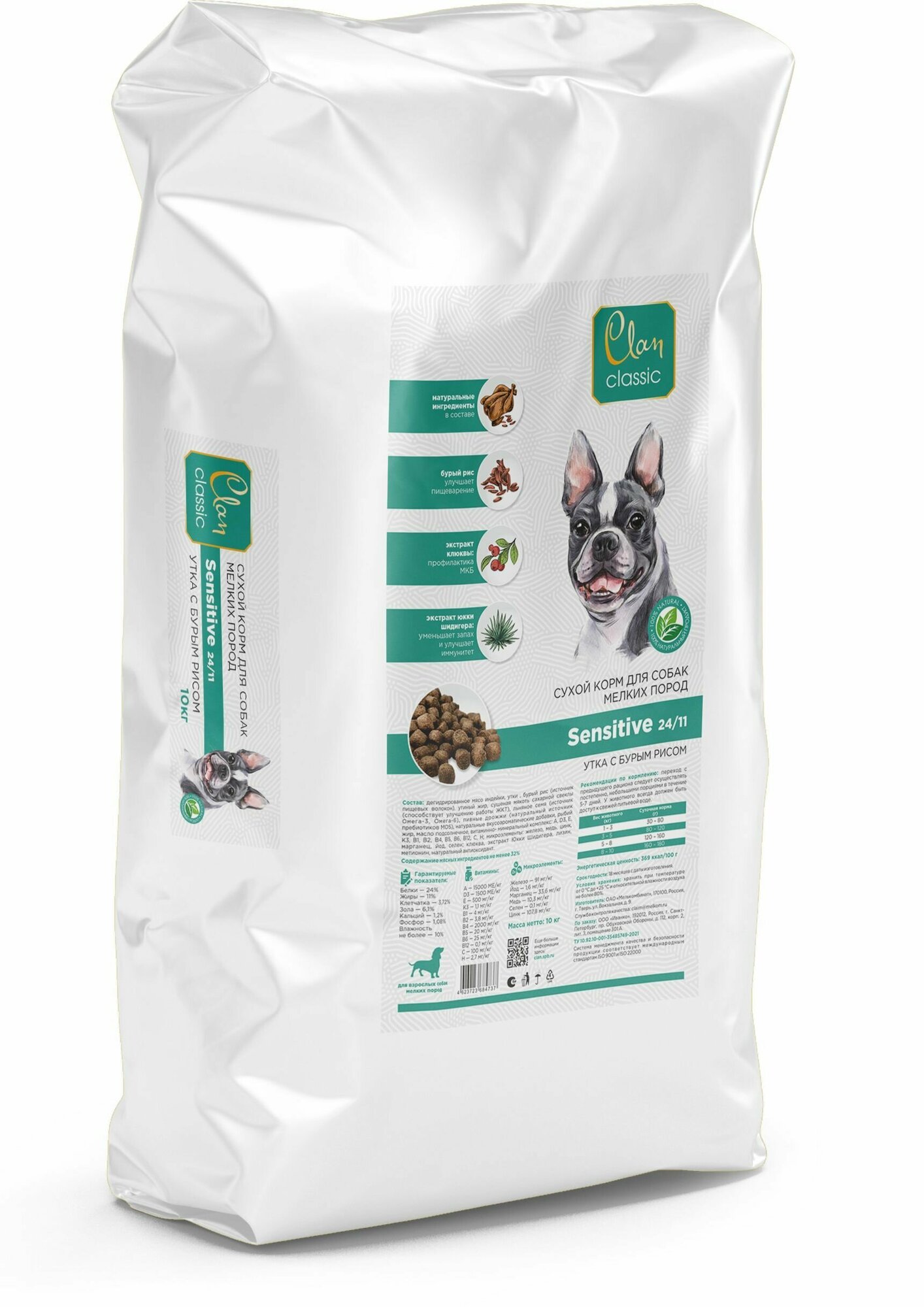 CLAN CLASSIC Sensitive-24/11 Сухой корм для собак мелких пород с чувствительным пищеварением 10 кг с уткой и бурым рисом