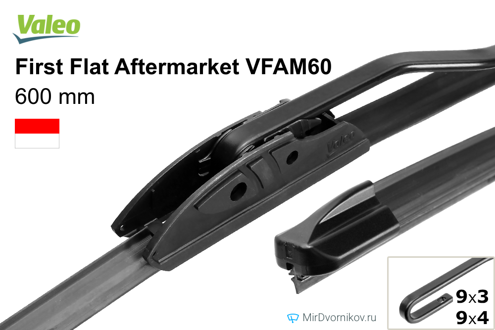 Бескаркасная щетка стеклоочистителя Valeo First Flat VFAM60, 600 мм. Крючок 9*3 / 9*4