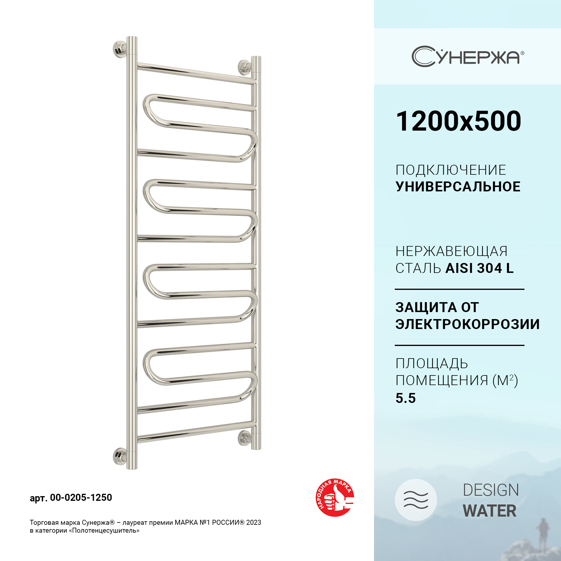 Полотенцесушитель водяной Сунержа Элегия+ 1200x500, полированная сталь 00-0205-1250