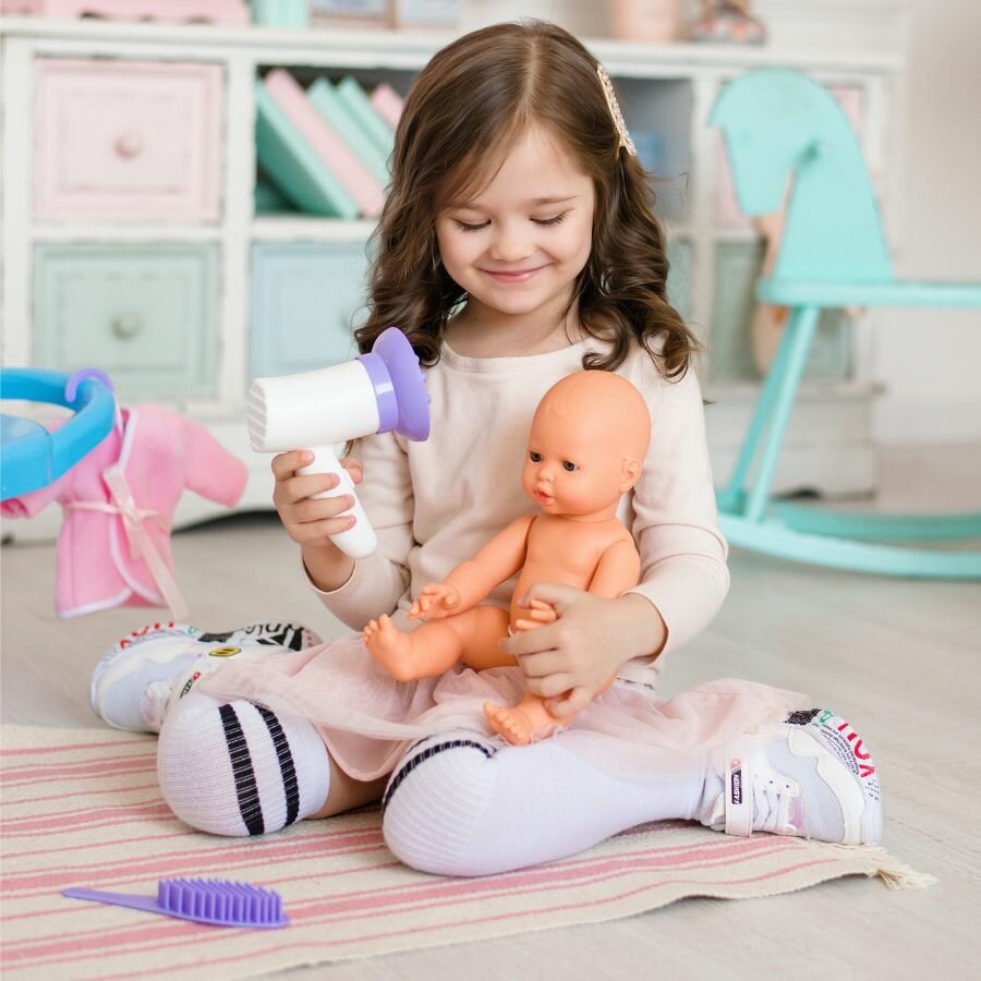 | Комплектация | пупс, ванна с пеленальным столиком, карманчиками для кукольных принадлежностей, фен, расчески (2 шт.), зеркальце, вешалки (2 шт.), миска, ложка, поильник, флакон |