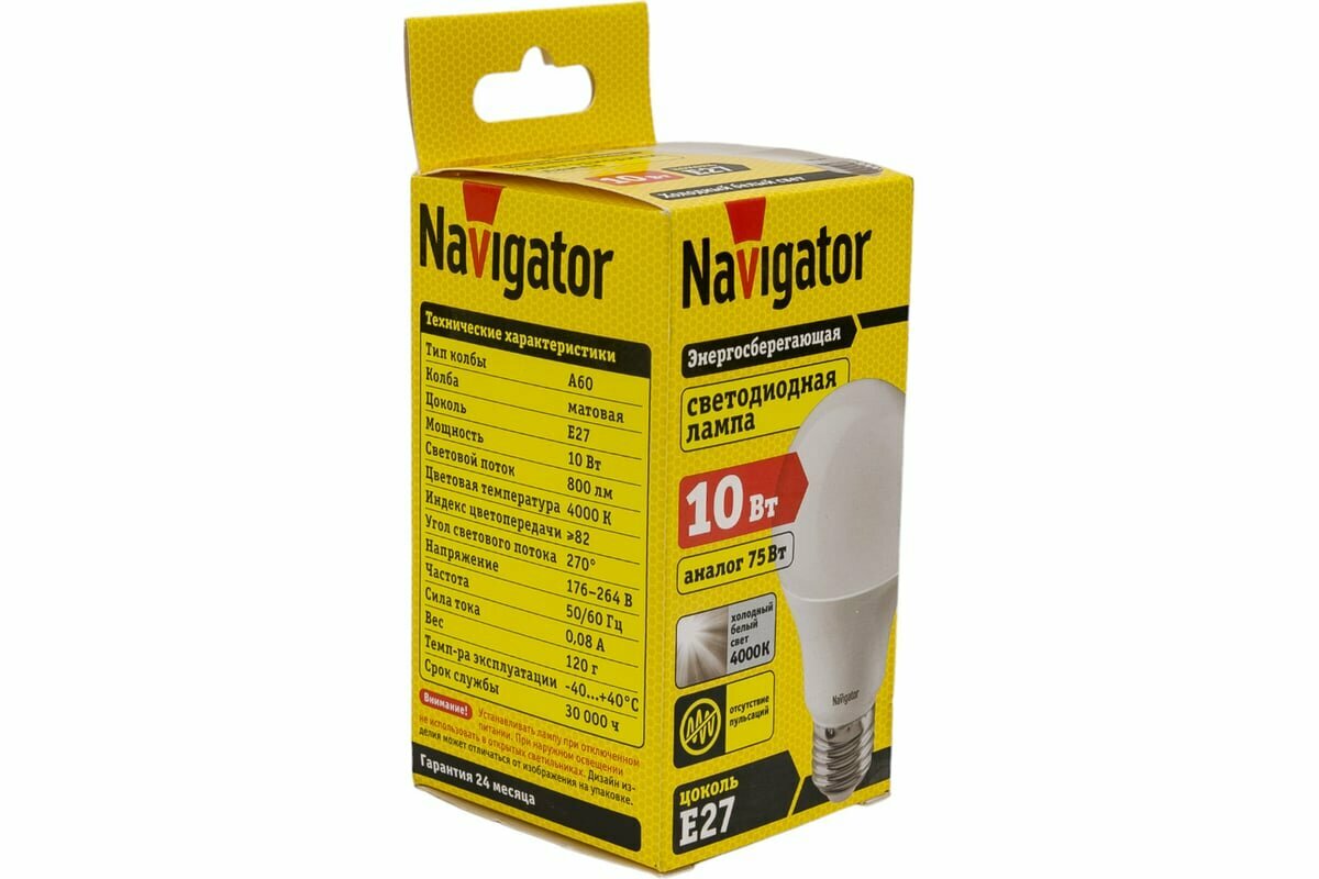 Ниже Вы можете прочитать отзывы на Светодиодная лампа Navigator 94 388 NLL-A60-10-230-4K-E27, ознакомится с подробными характеристиками, посмотреть интересные обзоры и фотографии на Светодиодная лампа Navigator 94 388 NLL-A60-10-230-4K-E27.