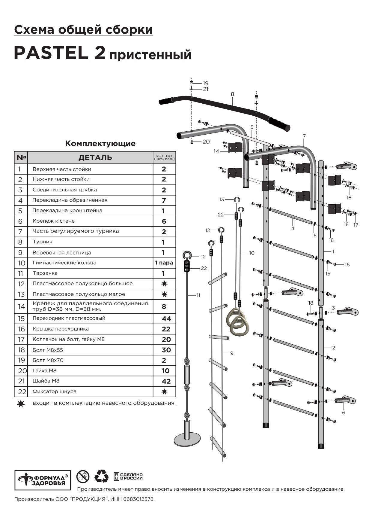 | Подробная комплектация | шведская стенка, турник, верёвочная лестница, тарзанка, кольца |
