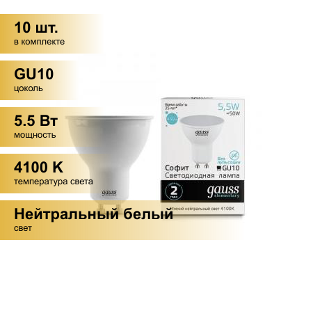 Упаковка ламп 10шт Gauss Elementary MR16 5.5W 450lm 4100К GU10 LED 1/10/100