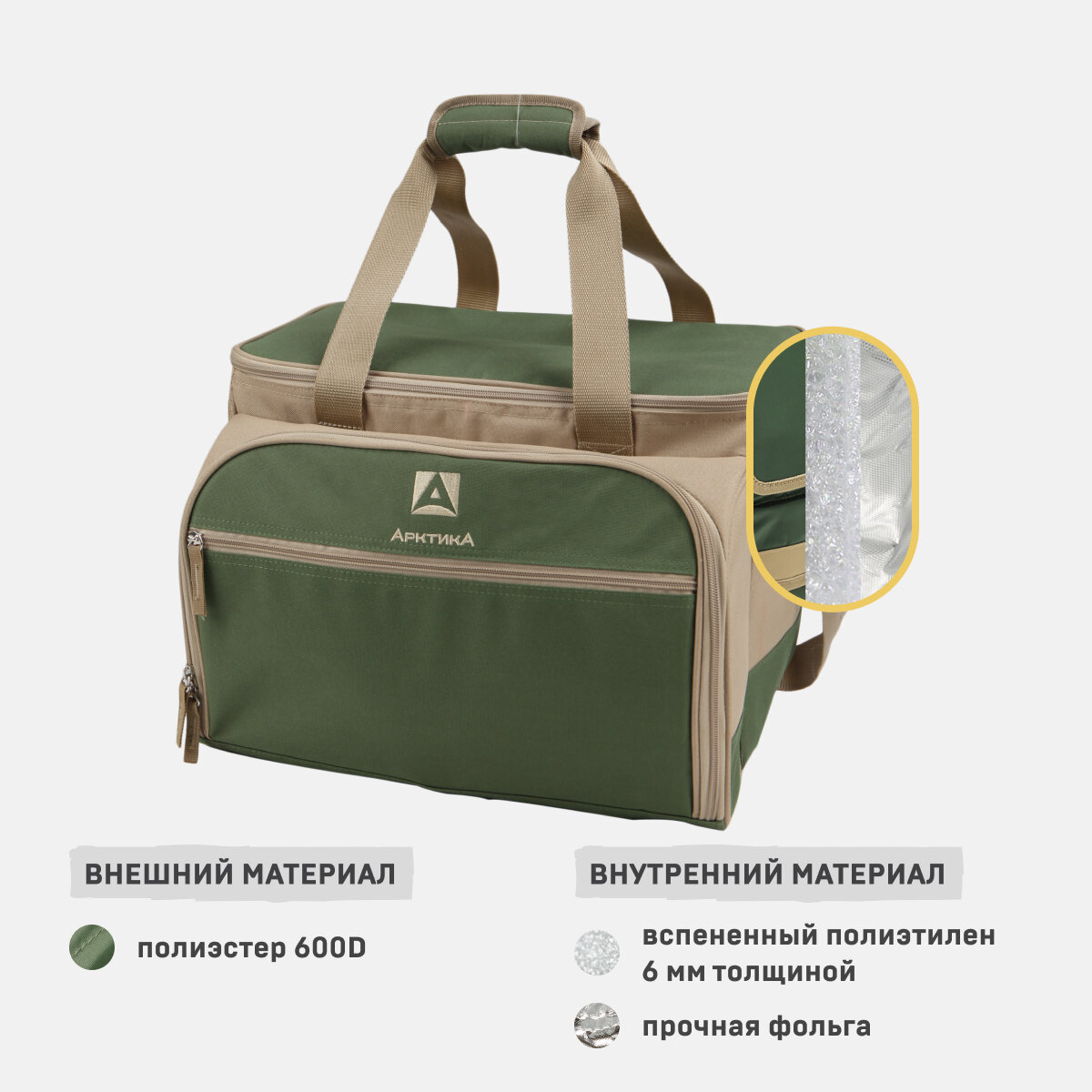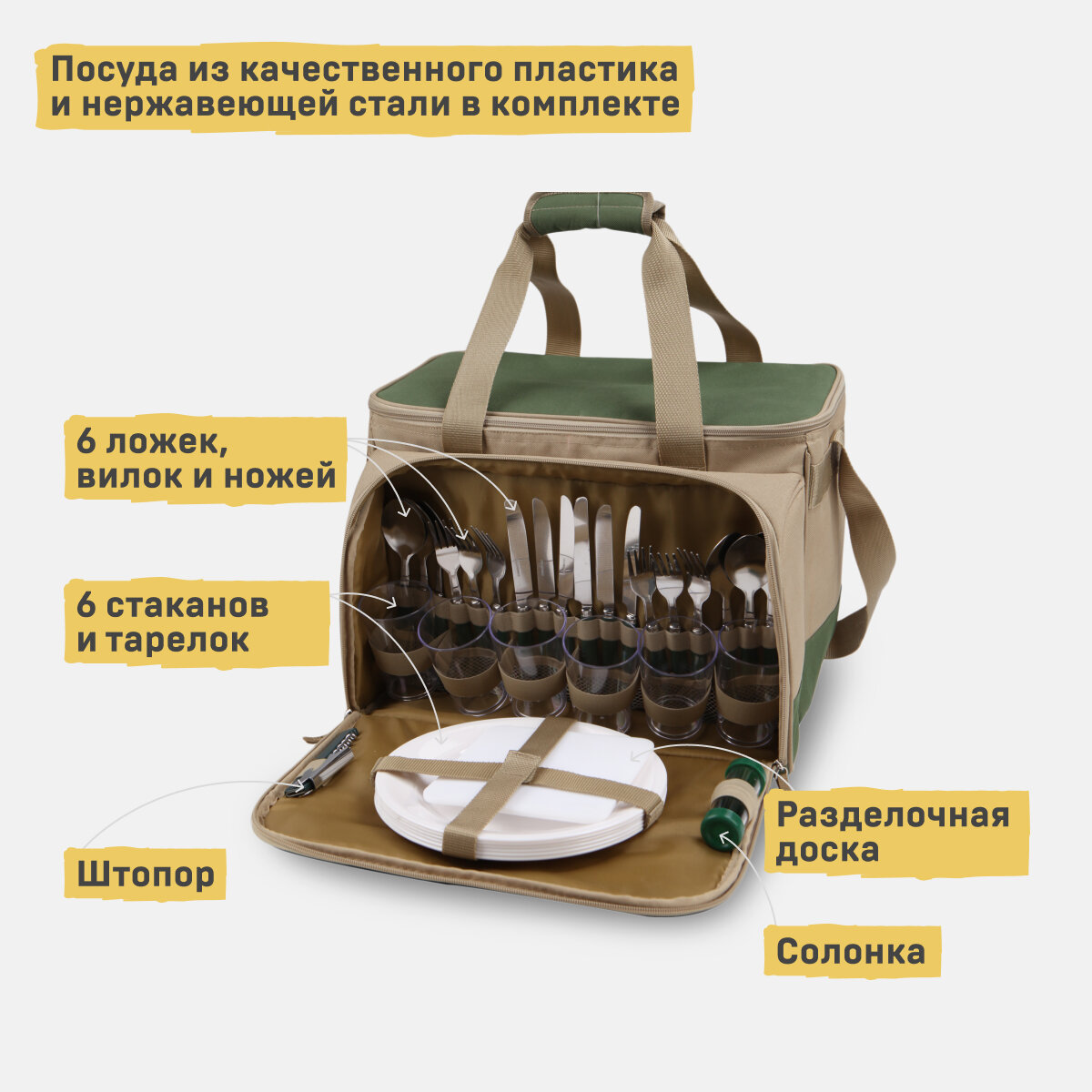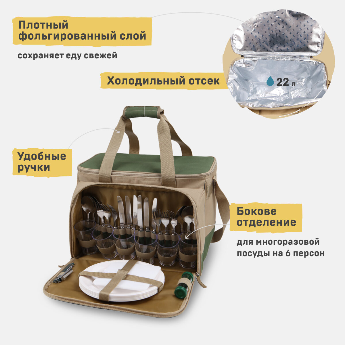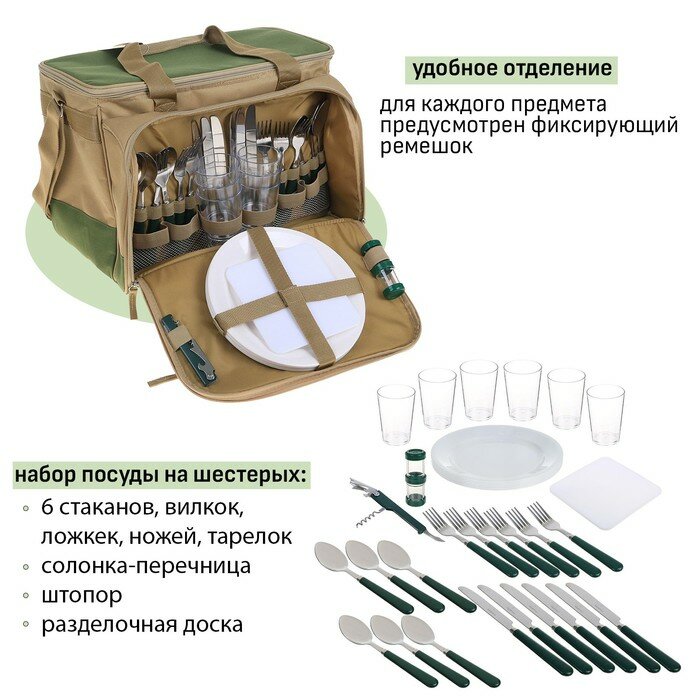 Набор для пикника с посудой на 6 персон и термосумкой Арктика 4100-6 бежевый/зеленый 22 литра сумка-холодильник 33 предмета в комплекте интересное: