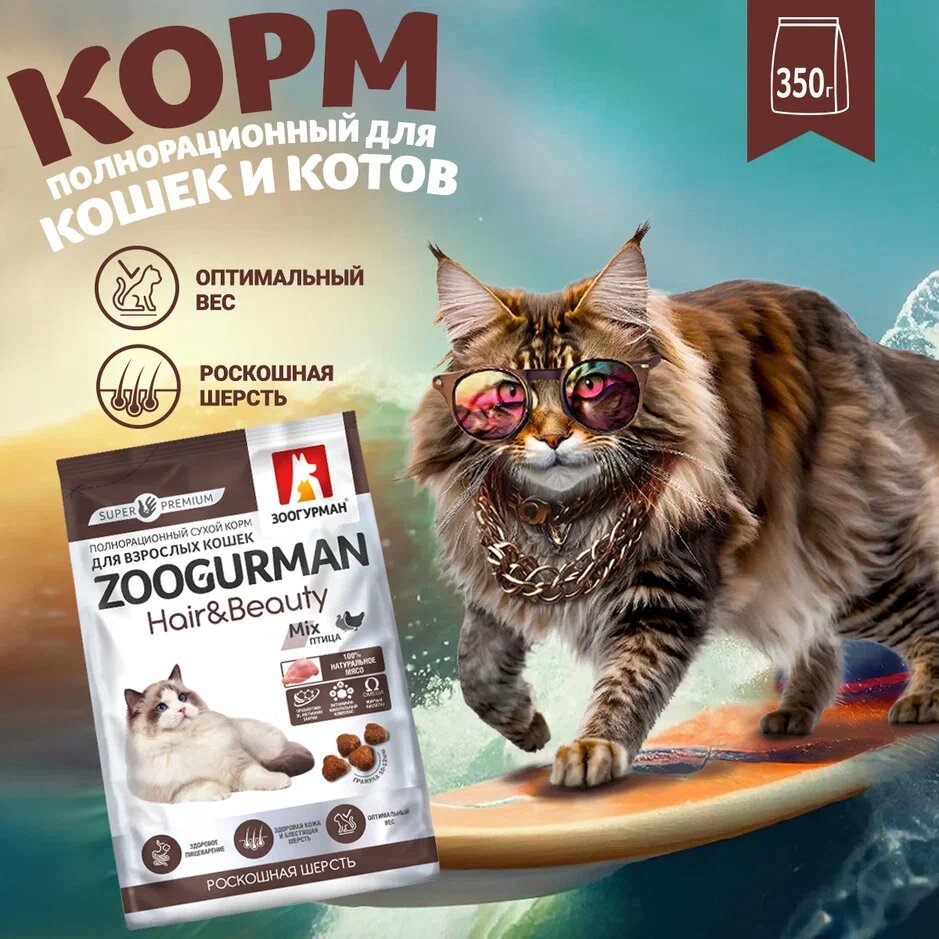 Корм Зоогурман Hair & Beauty Mix для кошек, уход за шерстью и кожей, с птицей, 350 г