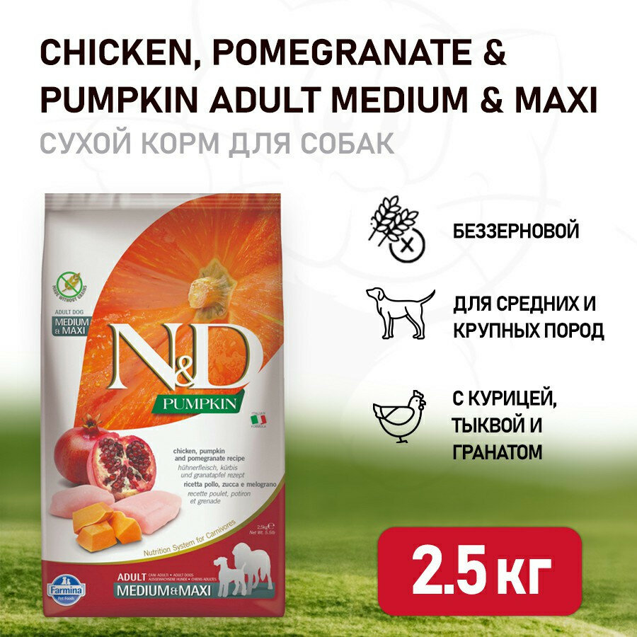 Farmina N&D Dog GF Pumpkin Adult Medium&Maxi корм для взрослых собак средних и крупных пород Цыпленок и гранат, 2,5 кг.