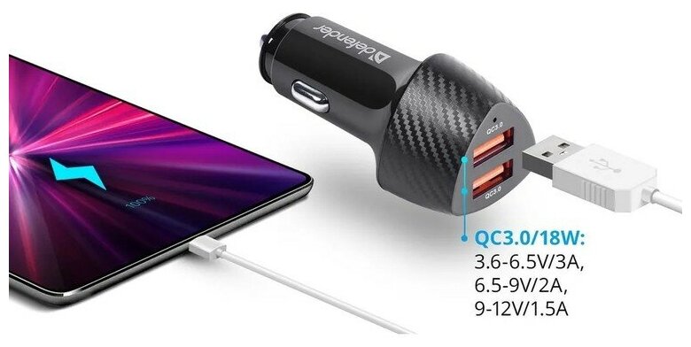 Автомобильная зарядка для телефона Defender UCA-81 2xUSB QC3.0, 36W / быстрая зарядка QC3.0 для телефона в прикуриватель