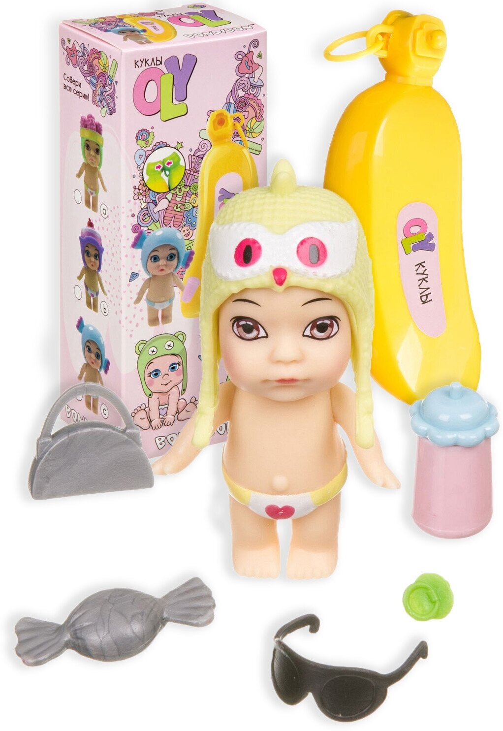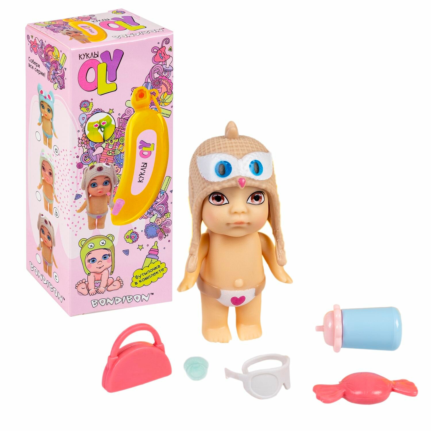 Набор игровой Bondibon куколка OLY в шапочке-ушанке с животным и аксессуарами в банане, ВОХ 15х6,6х1, арт. ВВ3844