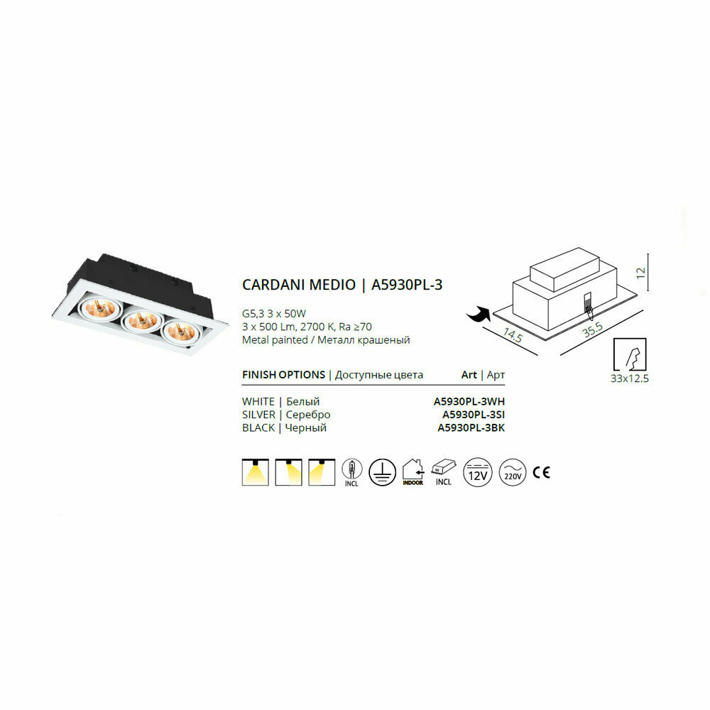 Встраиваемый светильник Arte Lamp CARDANI MEDIO A5930PL-3WH