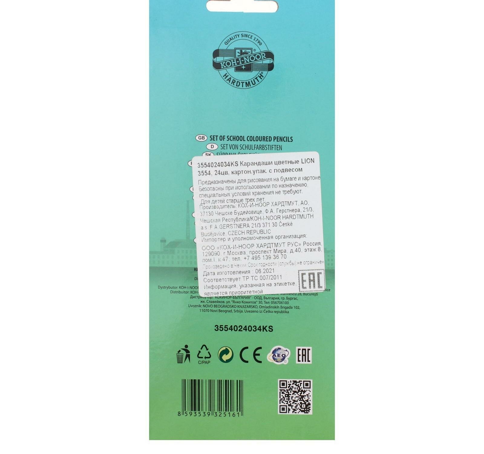 Карандаши 24 цвета Koh-I-Noor LION 3554, картонная упаковка, европодвес