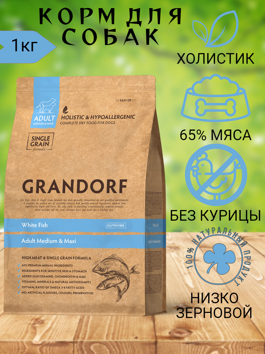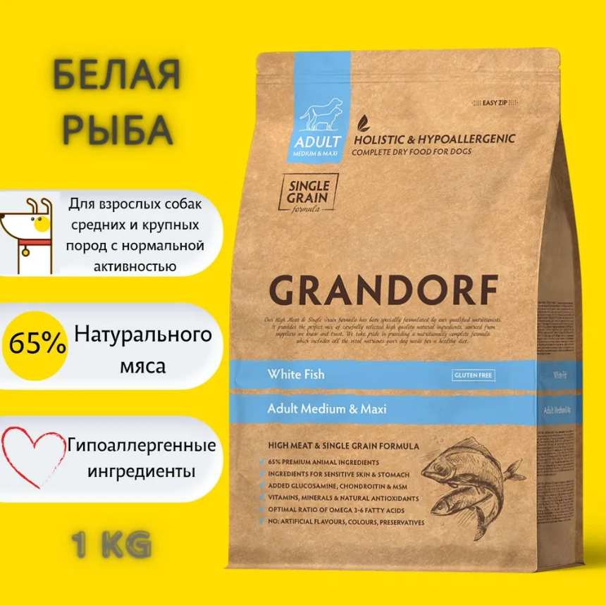 GRANDORF SINGLE GRAIN DOG ADULT MEDIUM & MAXI WHITE FISH низкозерновой для взрослых собак средних и крупных пород с белой рыбой (1 кг х 6 шт)
