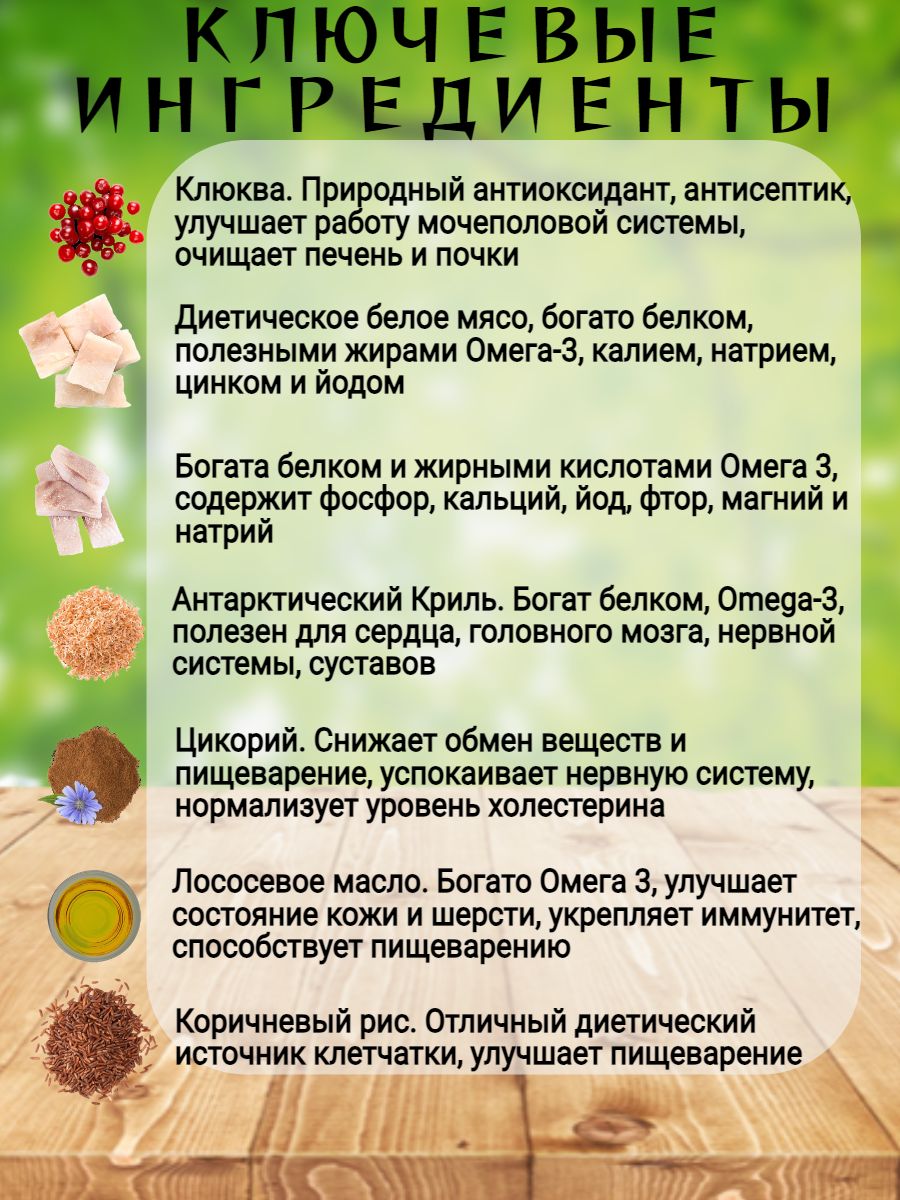 | Состав | дегидрированное мясо трески, дегидрированное мясо сельди, цельный белый рис, жир индейки, экстракт цикория (естественный источник FOS и инулина), сушеный сладкий картофель (батат), сушеный шпинат, свежее масло лосося, мука из плода рожкового дерева, сушеное яблоко, сушеный антарктический криль (естественный источник EPA и DHA), пивные дрожжи (естественный источник MOS), L-Карнитин, глюкозамин, хондроитин, МСМ (Метилсульфонилметан), комплекс натуральных антиоксидантов (экстракт розмарина, грейпфрута, апельсина, куркумы и сизигиума) |