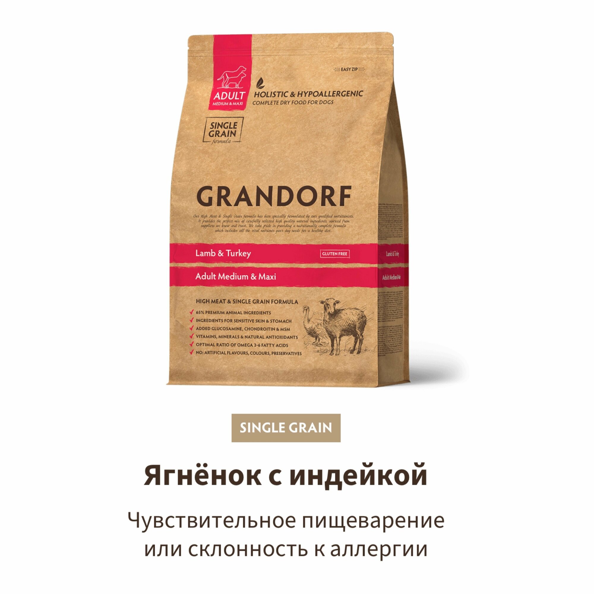 Grandorf Ягнёнок с индейкой 3кг. Для собак средних и крупных пород . Низкозерновой, гипоаллергенный, холистик.