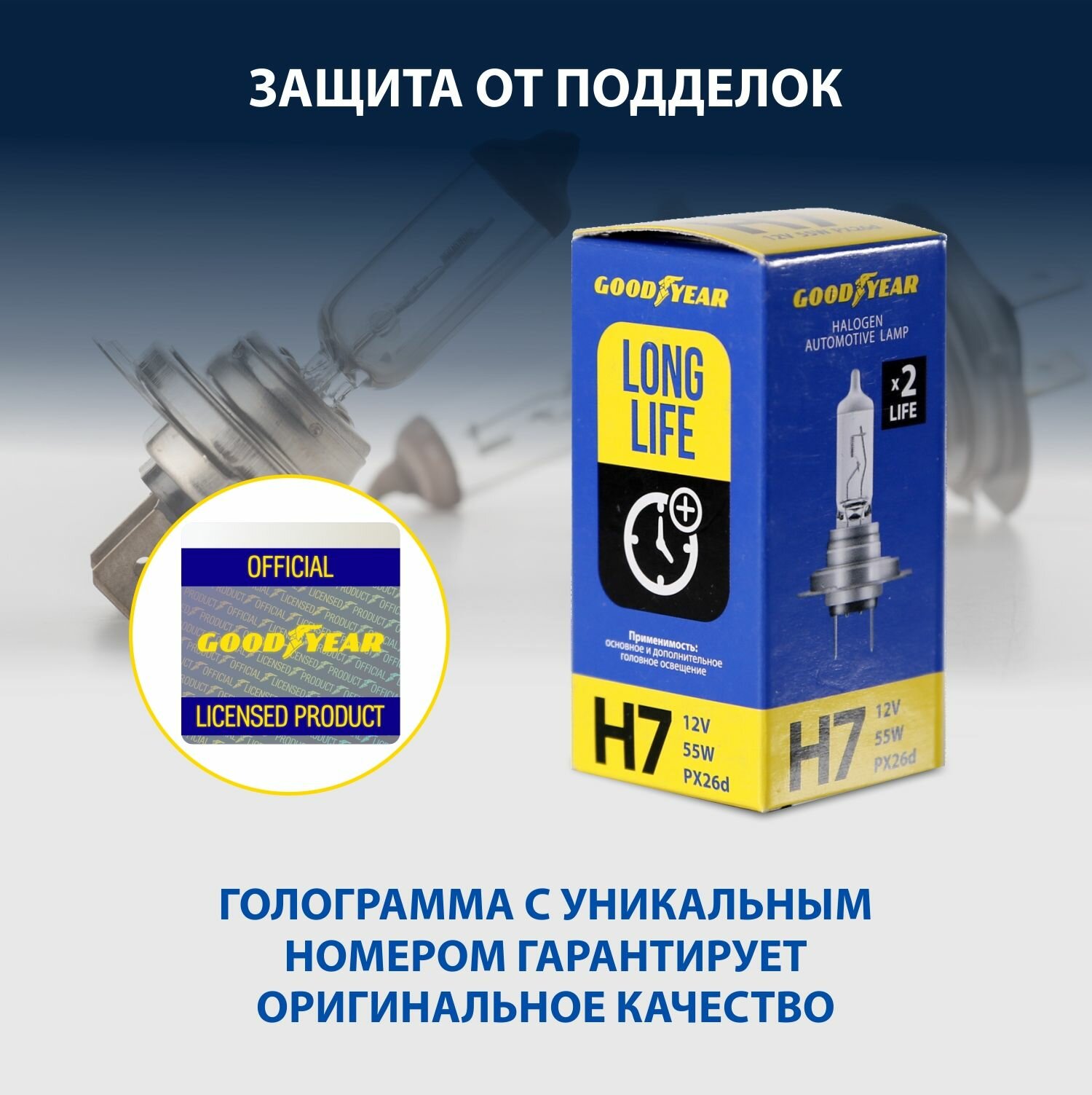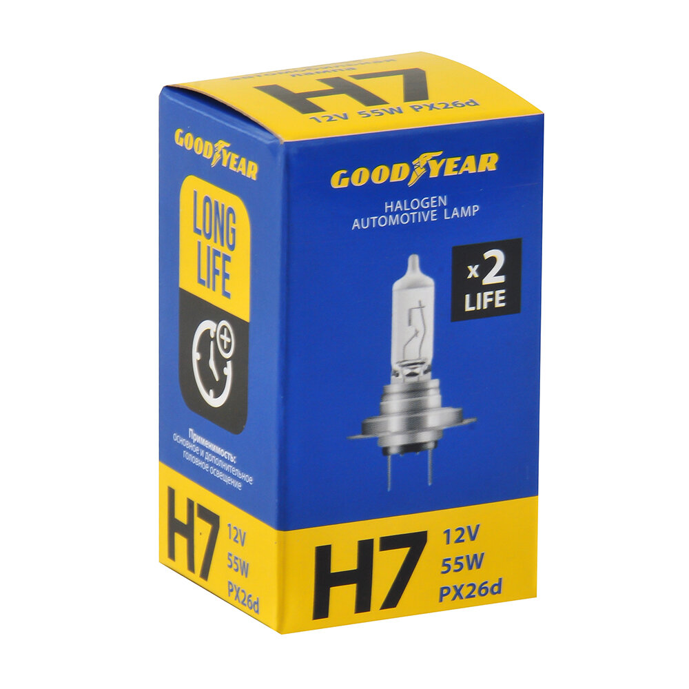 Лампа h7 галогеновая автомобильная Long Life Goodyear 12V 55W PX26d для Lada (Vesta/ Калина/ XRAY/ Priora/ Chevrolet-Niva) UAZ Patriot, VW Tiguan, Touareg, Passat B6 B7