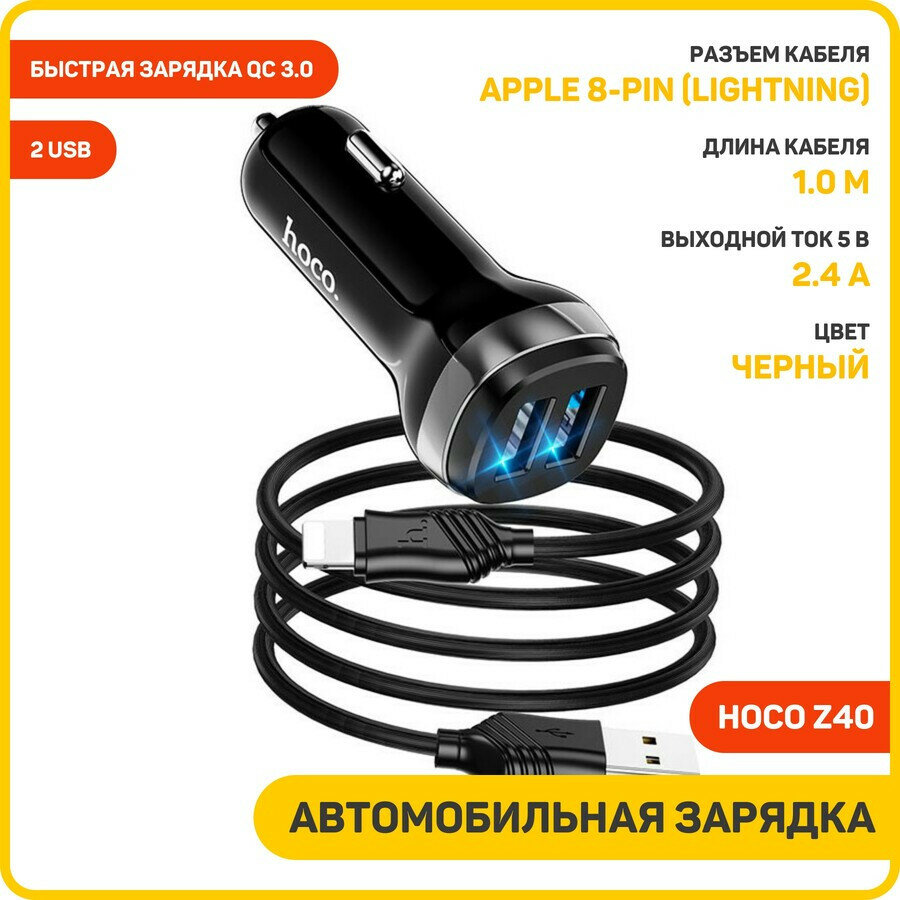 Автомобильное зарядное устройство (АЗУ) Hoco Z40 (2 USB) + кабель Lightning, 2.4 А, черный