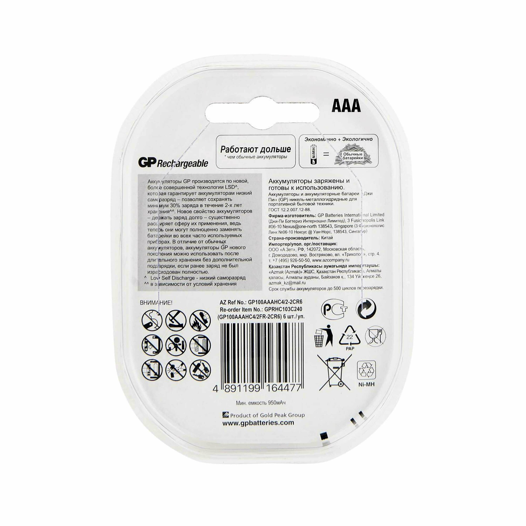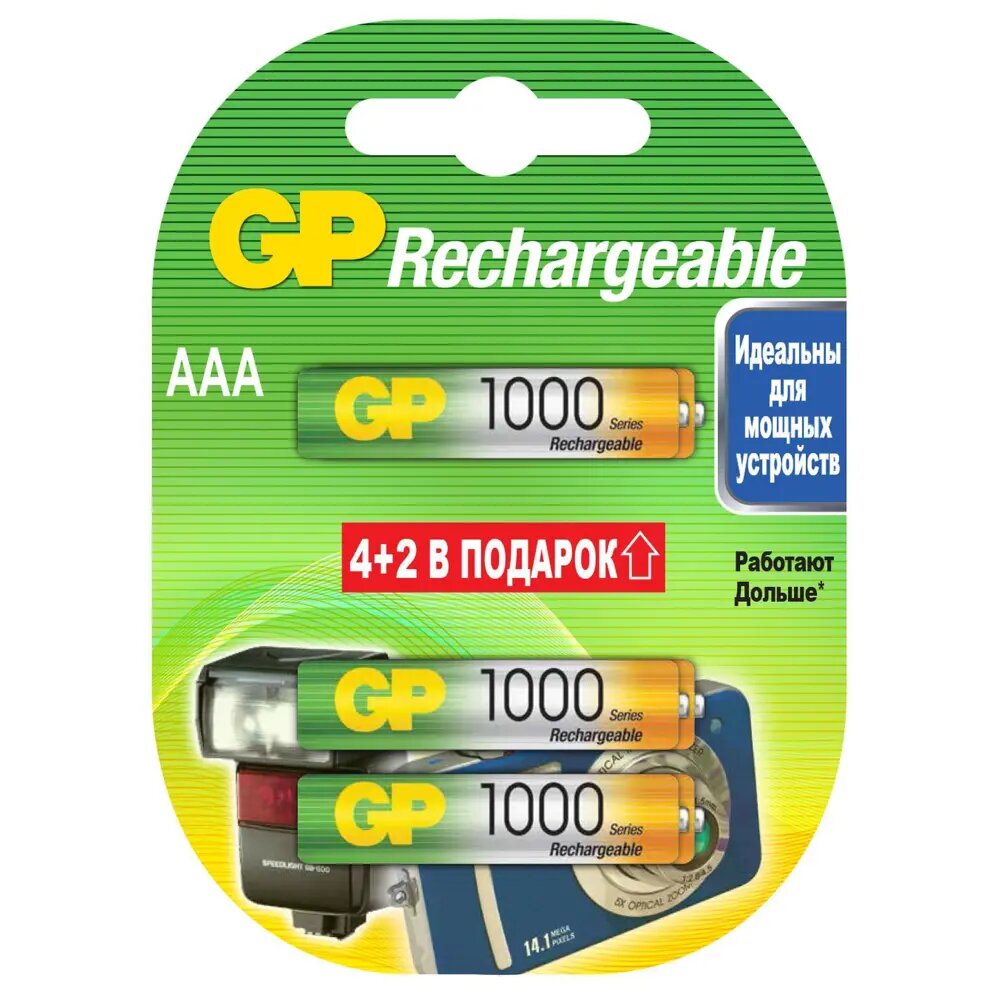 AAA Аккумуляторная батарейка GP Rechargeable 100AAAHC4/2, 6 шт. 1000мAч