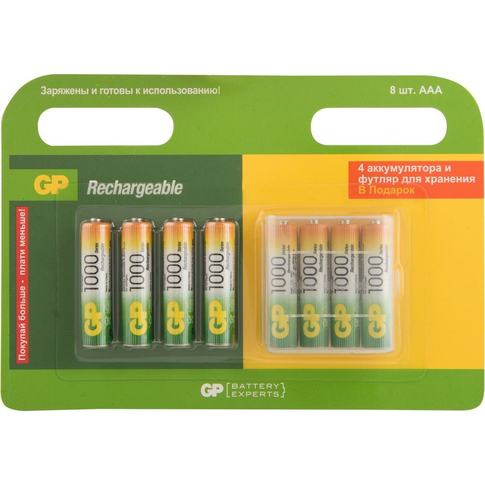 Перезаряжаемые аккумуляторы GP 100AAAHC AAA, емкость 930 мАч - 8 шт. в промо-блистере 4+4+футляр