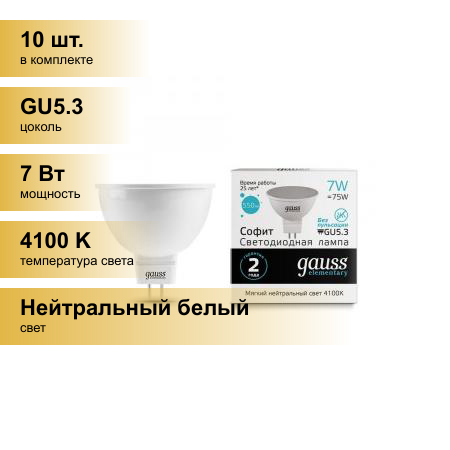 Упаковка светодиодных ламп 10 шт. gauss Elementary 13527, GU5.3, MR16, 7Вт, 4100 К
