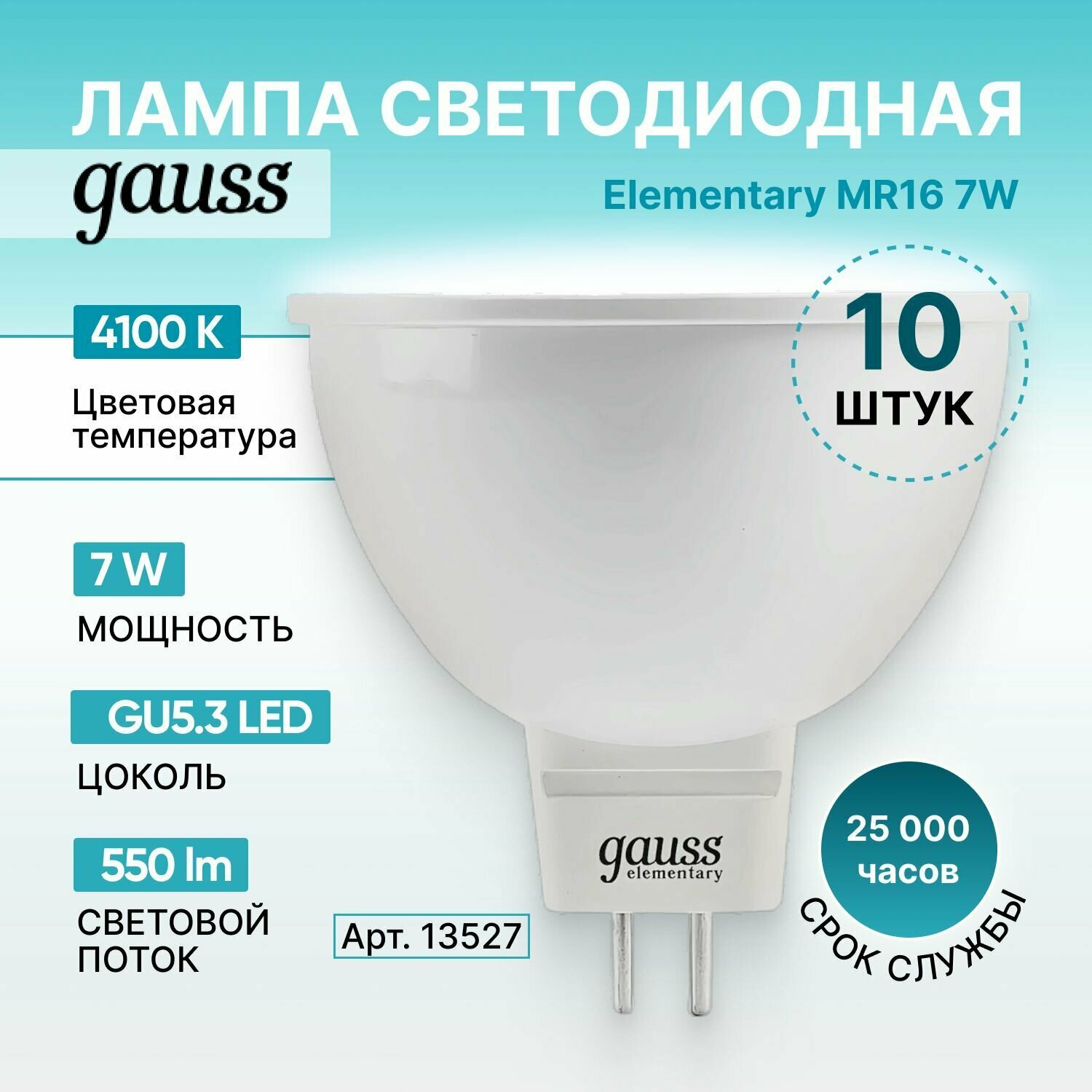 (10 шт.) Светодиодная лампочка Gauss Elementary MR16 GU5.3 220V 7W(550lm) 4100K 4K 57x50 пластик/алюм. 13527
