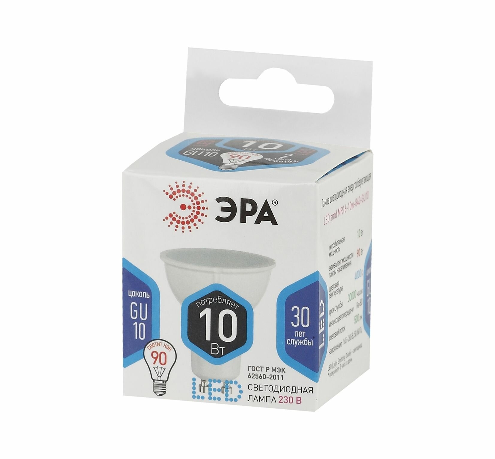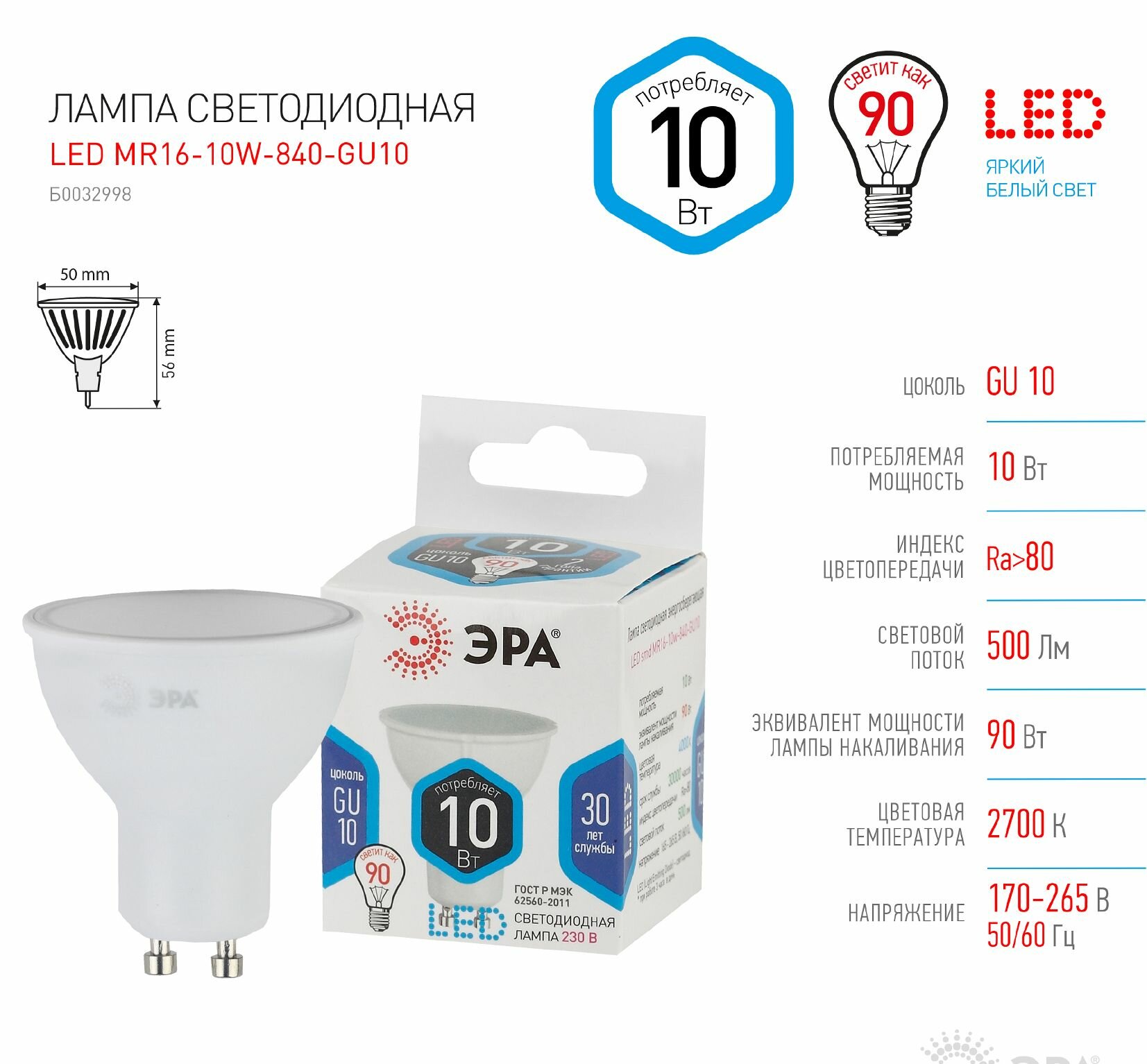 (10 шт.) Светодиодная лампочка ЭРА MR16, мощность 10Вт, напряжение питания 170-265В, цоколь GU10, цветовая температура 4000К, нейтральный белый свет, размер 50х57мм, Б0032998