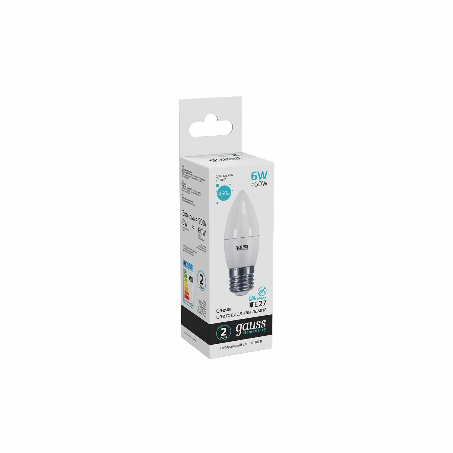 (5 шт)Лампа Gauss Elementary Свеча 6W 450lm 4100K Е27 LED 1/10/100