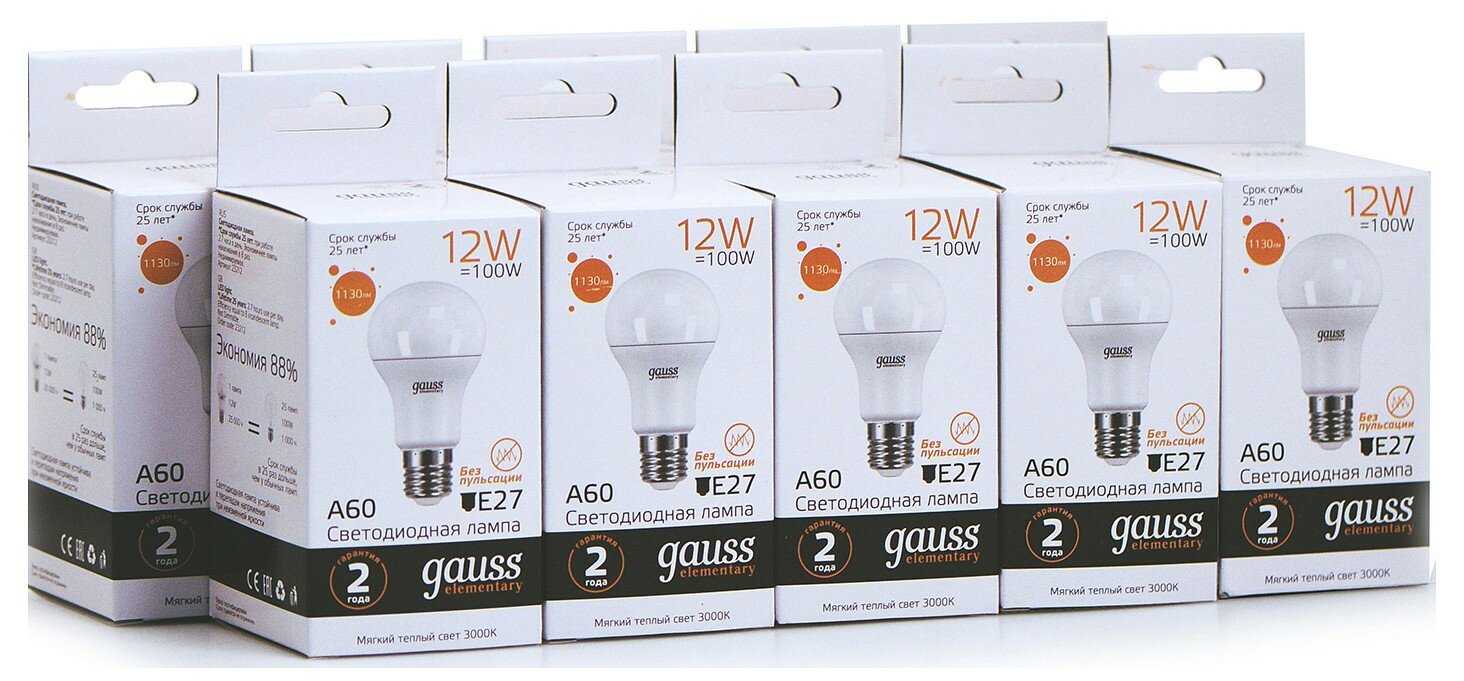 10шт. Gauss Лампа Elementary A60 12W 1130lm 3000K E27 LED, 23212