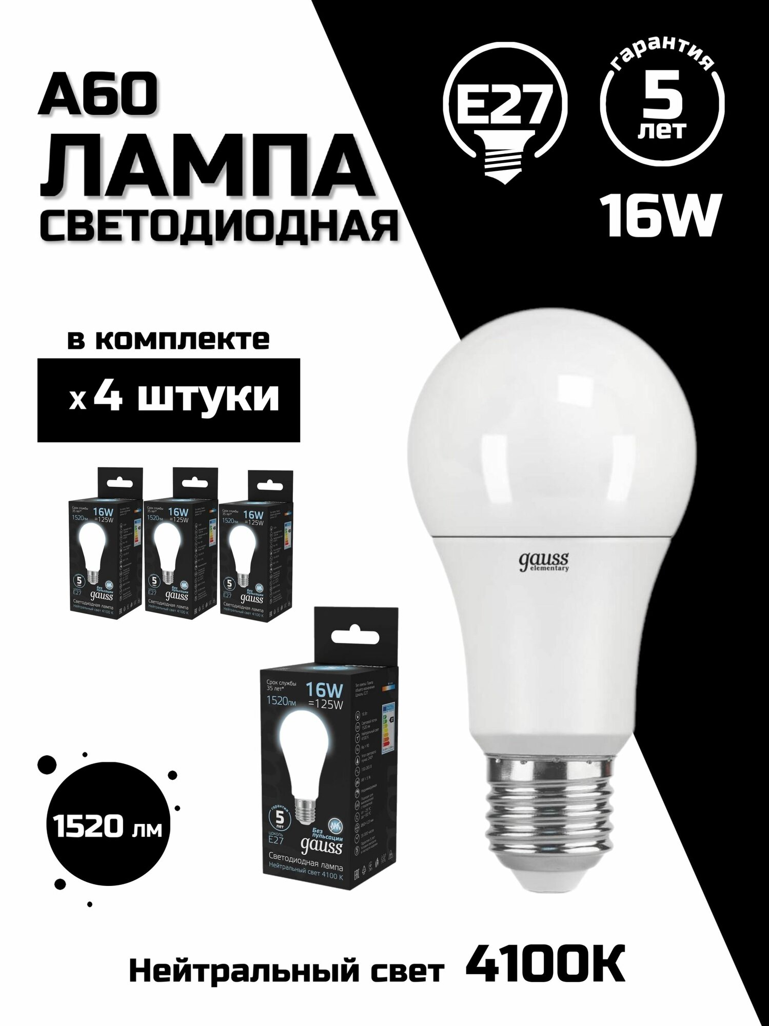 (4 шт)Лампа Gauss A60 16W 1520lm 4100K E27 LED