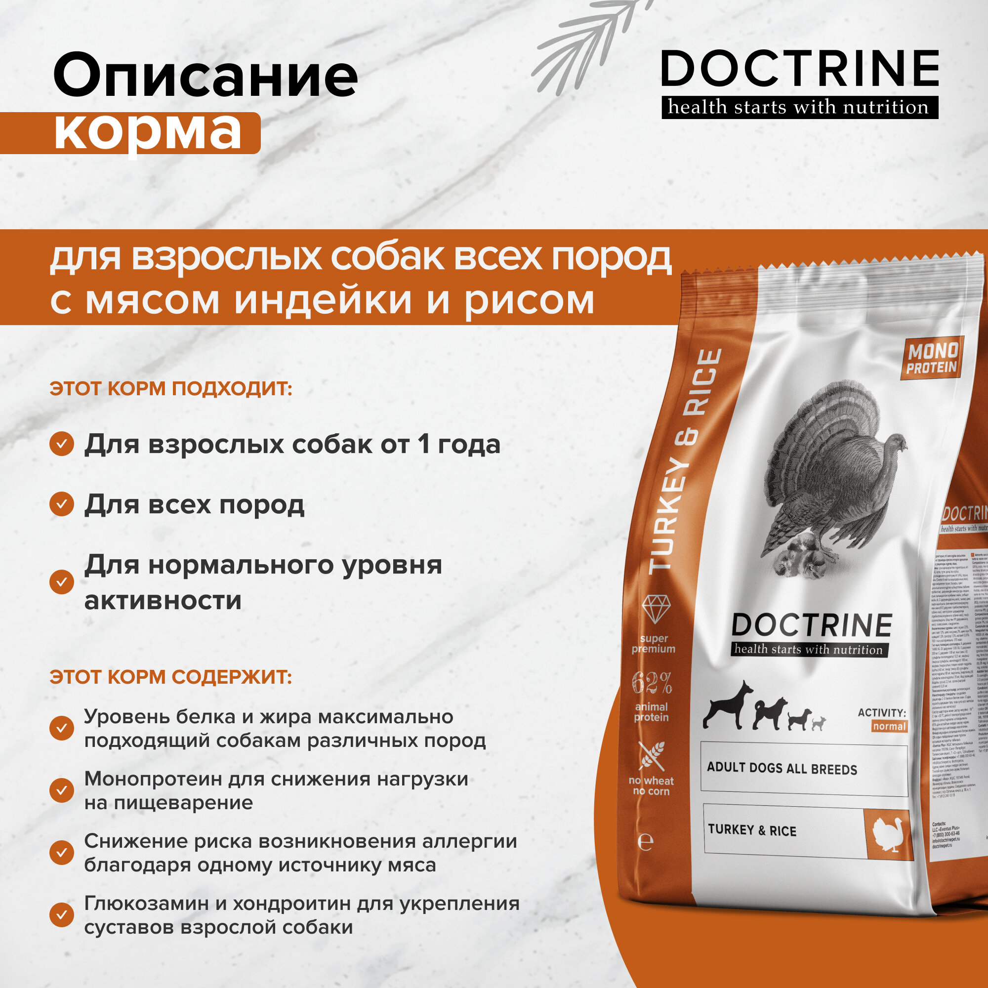 Корм DOCTRINE для взрослых собак всех пород с индейкой, 18 кг