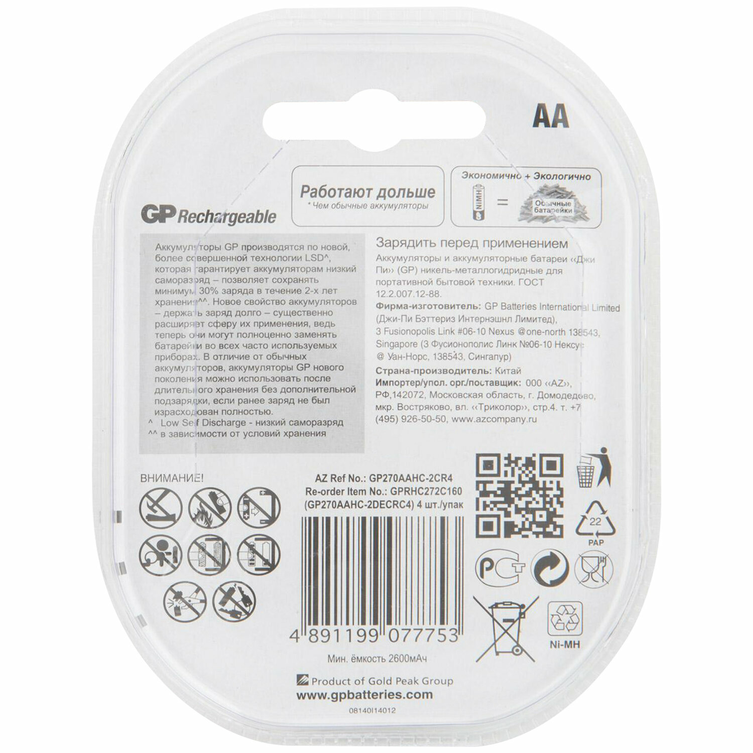 Купить Батарейки аккумуляторные комплект 4 шт., GP, АА (HR6), Ni-Mh, 2700 mAh, блистер, 270AAHC-2DECRC4