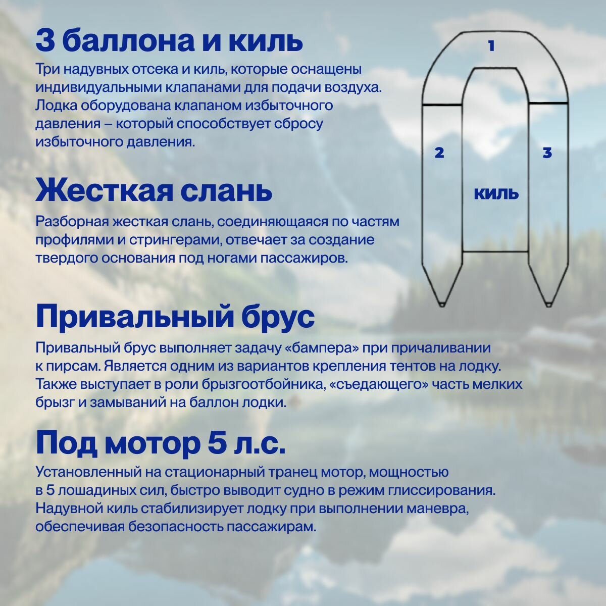| Дополнительная информация | диаметр баллона: 40 см; вес комплекта: 30 кг; длина кокпита: 225 см; ширина кокпита: 53 см; количество воздушных отсеков: 3; материал дна: армированный ПВХ; тип шва: ручное склеивание |