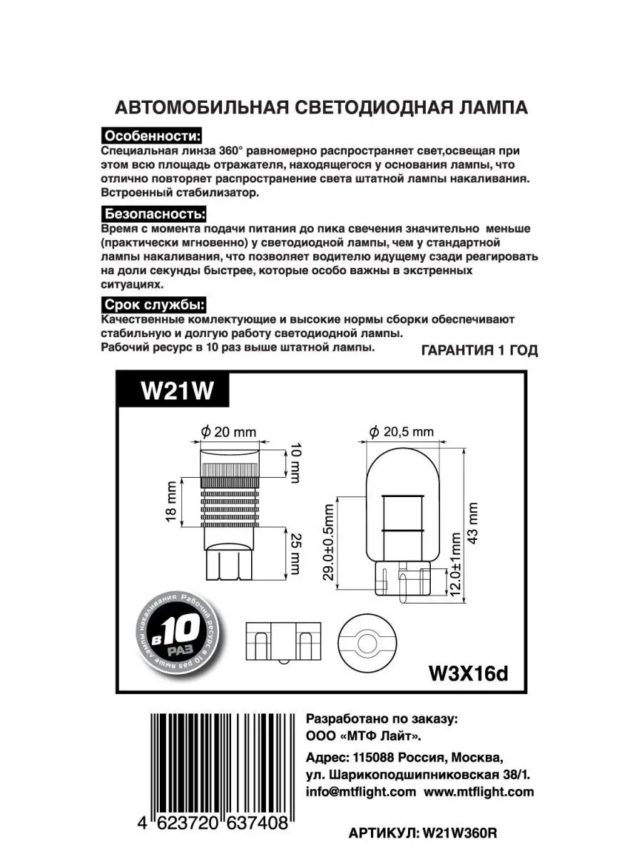 Купить MTF-LIGHT W21W360R ампа светодиодная 12V W21W W3X16D бесцокоьная бистер (1.) MTF