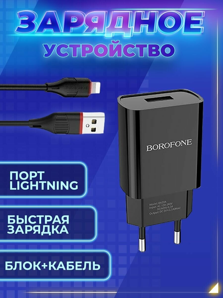 Сетевое зарядное устройство (СЗУ) Borofone BA20A (USB) + кабель Lightning, 2.1 А, черный