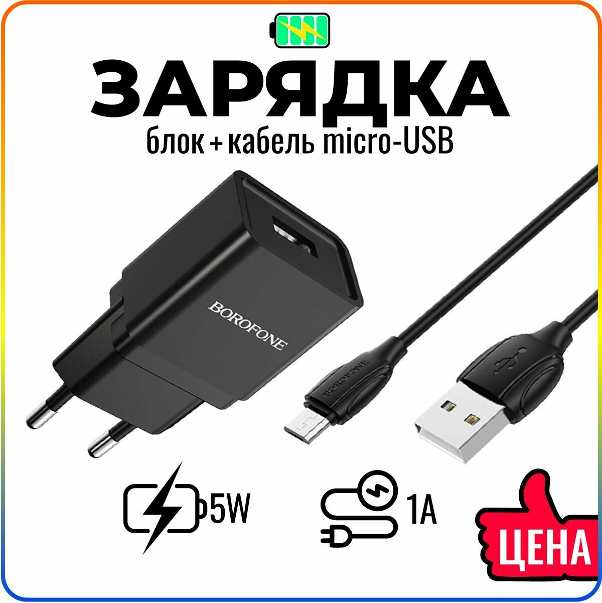 Сетевой адаптер питания Borofone BA19A Nimble Black зарядка 1А USB-порт + кабель microUSB, черный