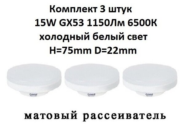 Лампочка светодиодная, General, Комплект из 3 шт, 15 Вт, Цоколь GX53, 4500К, Форма лампы Шайба, GX53