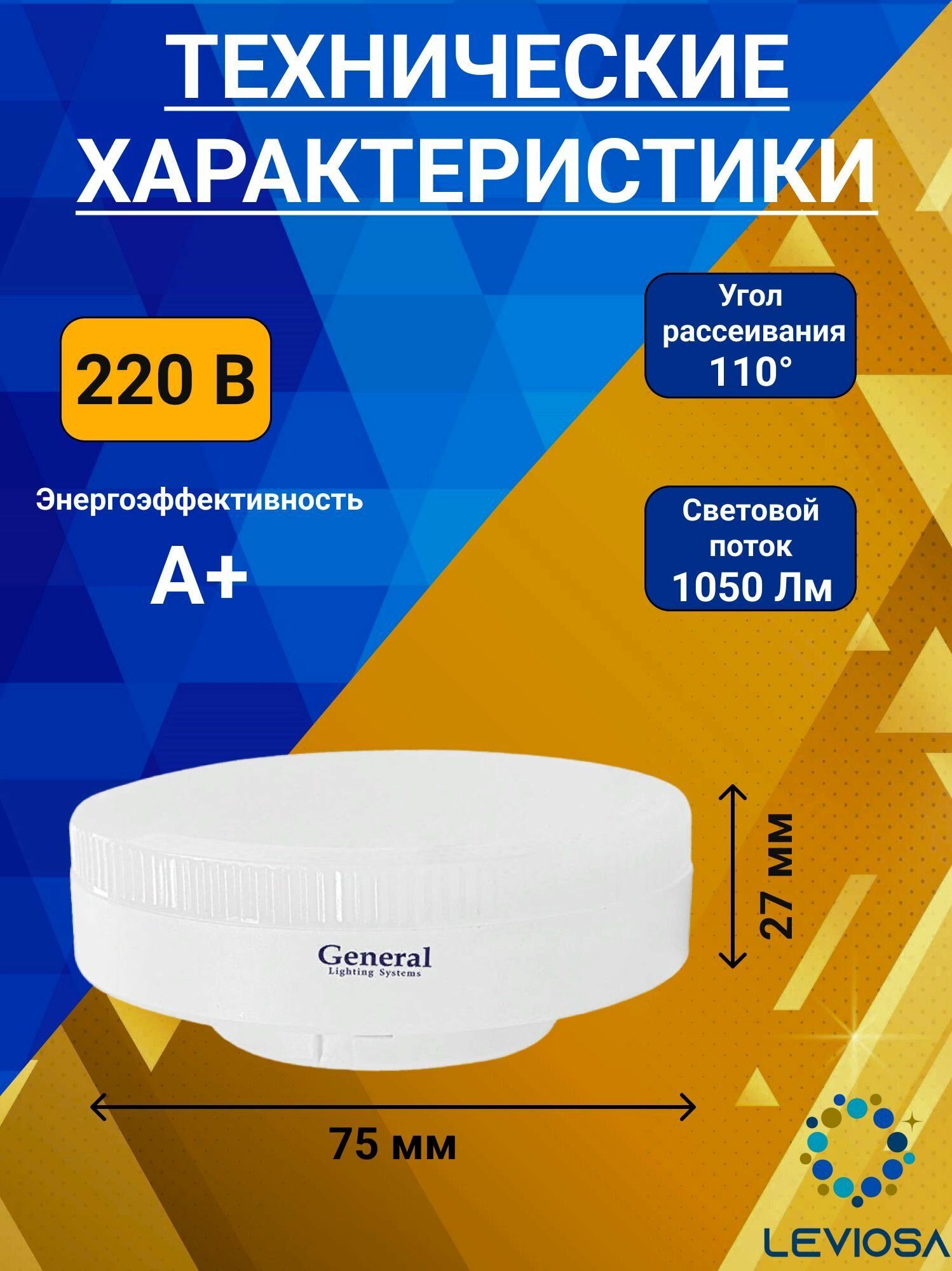 Лампочка светодиодная, General, Комплект из 10 шт, 12 Вт, Цоколь GX53, 4500К, Форма лампы Шайба, GX53