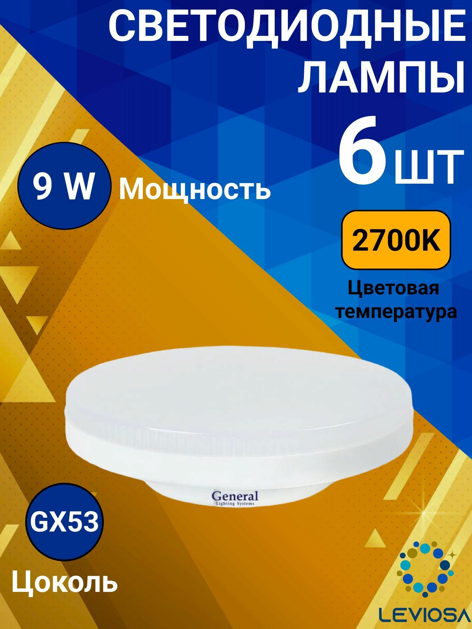 General, Лампа светодиодная, Комплект из 6 шт., 9 Вт, Цоколь GX53, 2700К, Форма лампы Шайба
