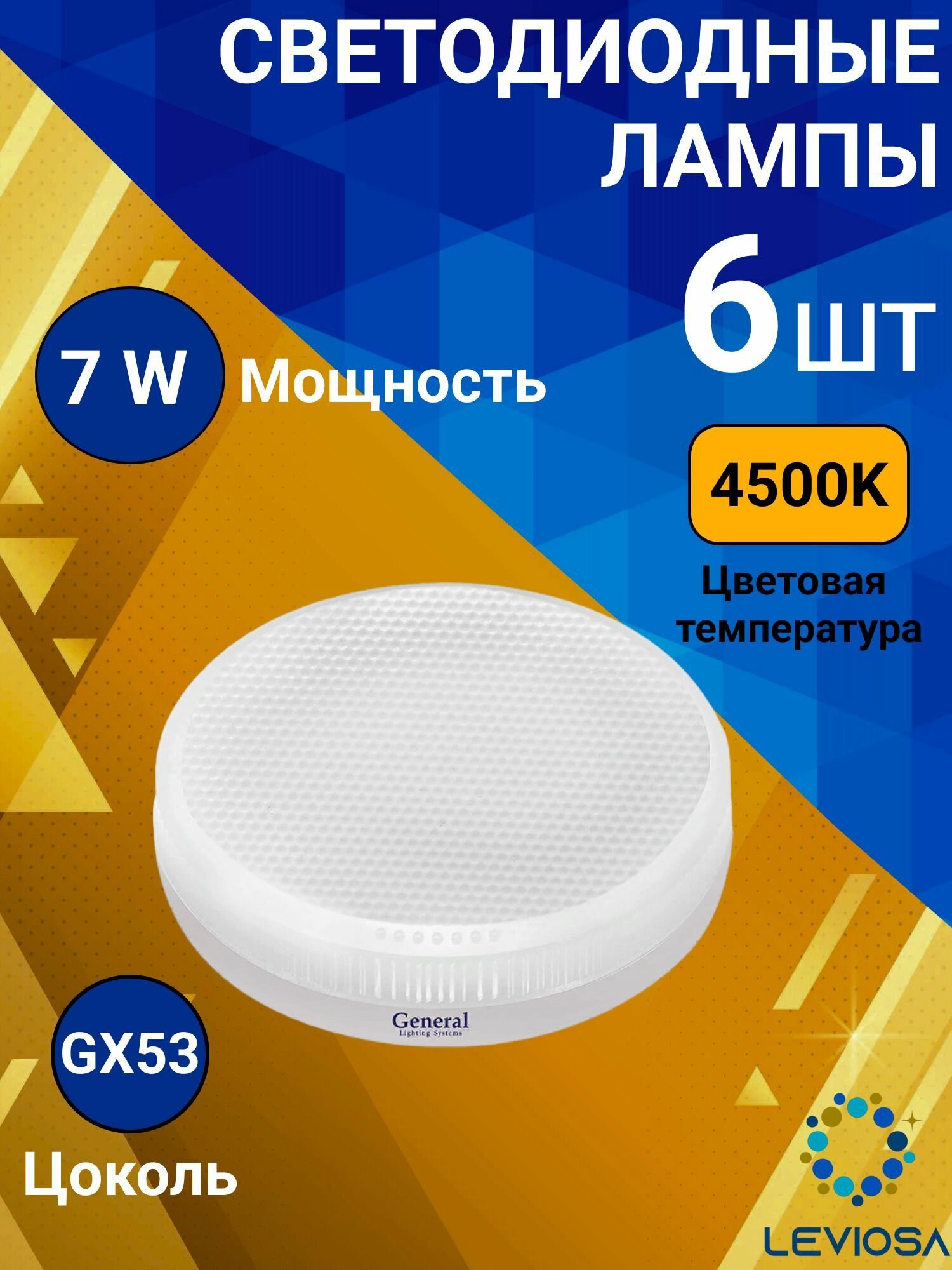 Купить Лампочка светодиодная, General, Комплект из 6 шт., 7 Вт, Цоколь GX53, 4500К, Форма лампы Шайба, GX53