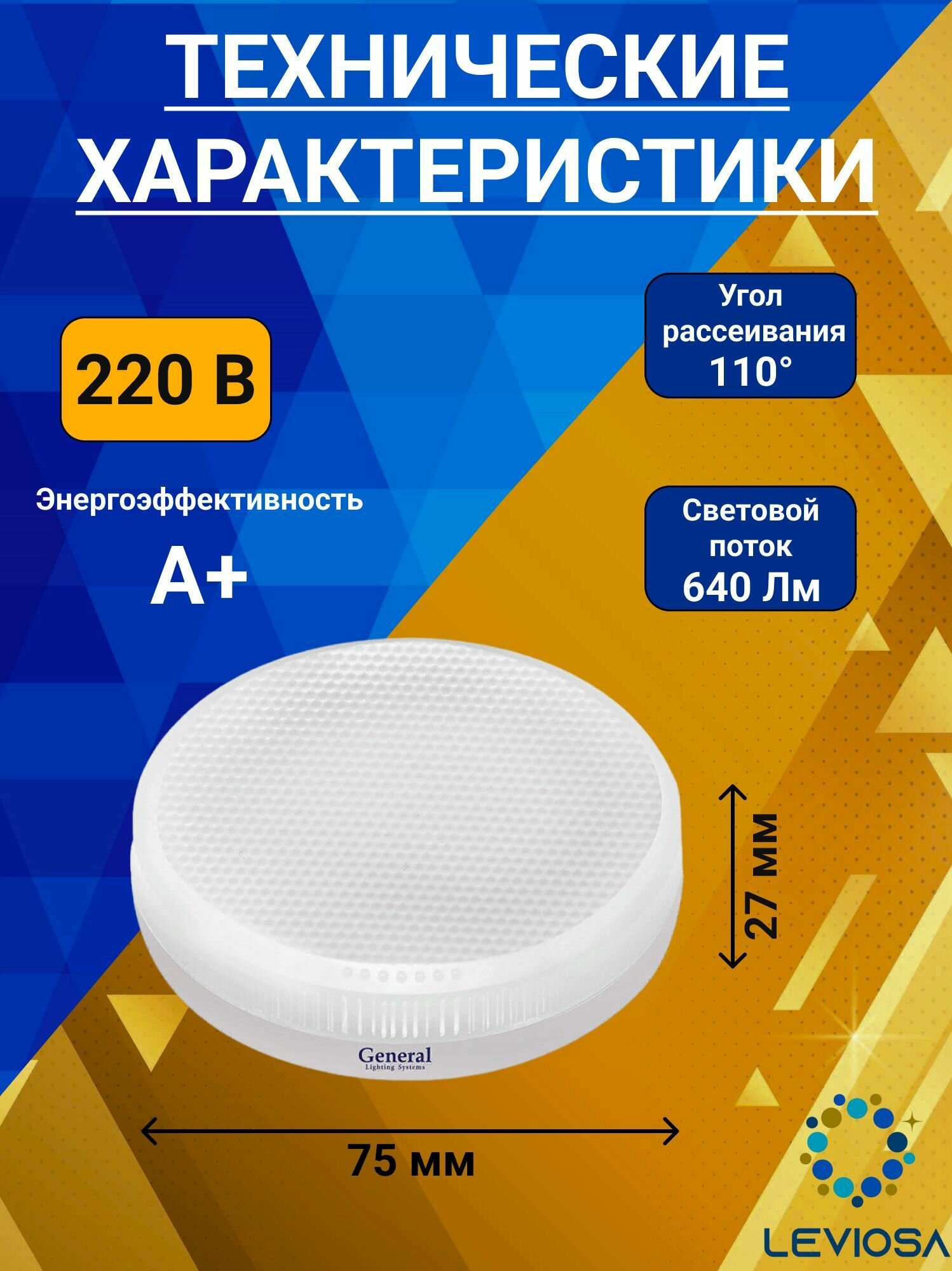 Лампочка светодиодная, General, Комплект из 10 шт., 9 Вт, Цоколь GX53, 6500К, Форма лампы Шайба, GX53