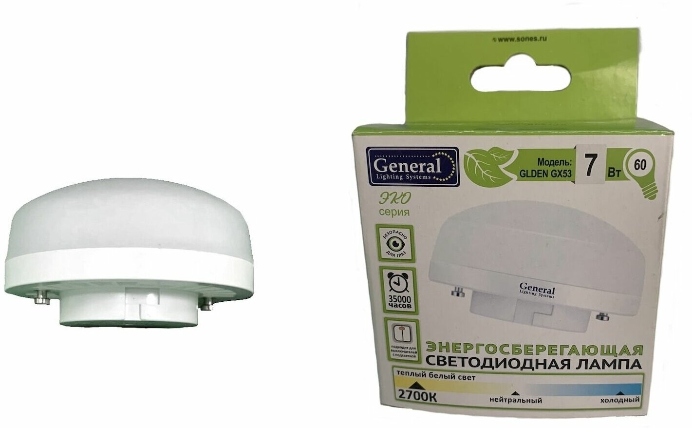 Лампочка светодиодная 7 Вт 660357, General GLDEN-GX53-7-230-GX53-2700 Рассеиватель Купол