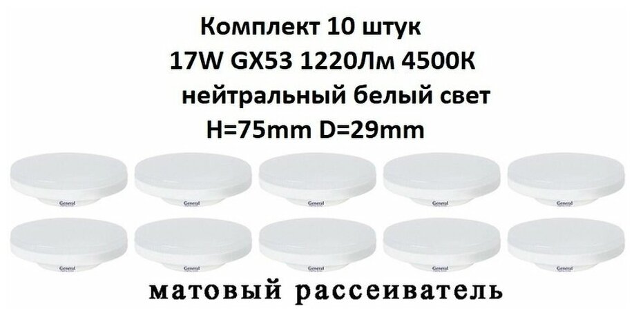 Светодиодные лампы, General, Комплект из 10 шт., Мощность 17 Вт, Цоколь GX53, Холодный свет