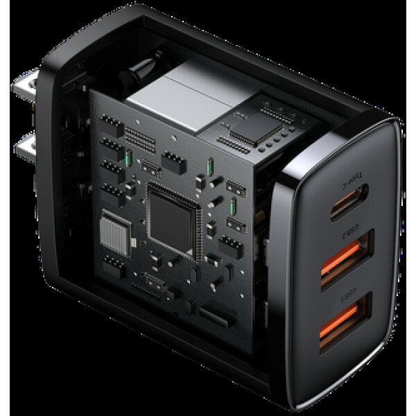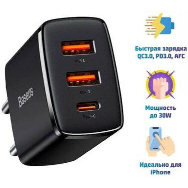 Зарядное устройство Baseus Compact Quick Charger 2*USB+USB-C, 3A, 30W, черный