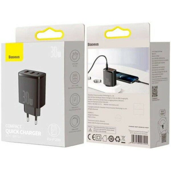 Зарядное устройство Baseus Compact Quick Charger 2xUSB USB Type-C 30W EU Black CCXJ-E01